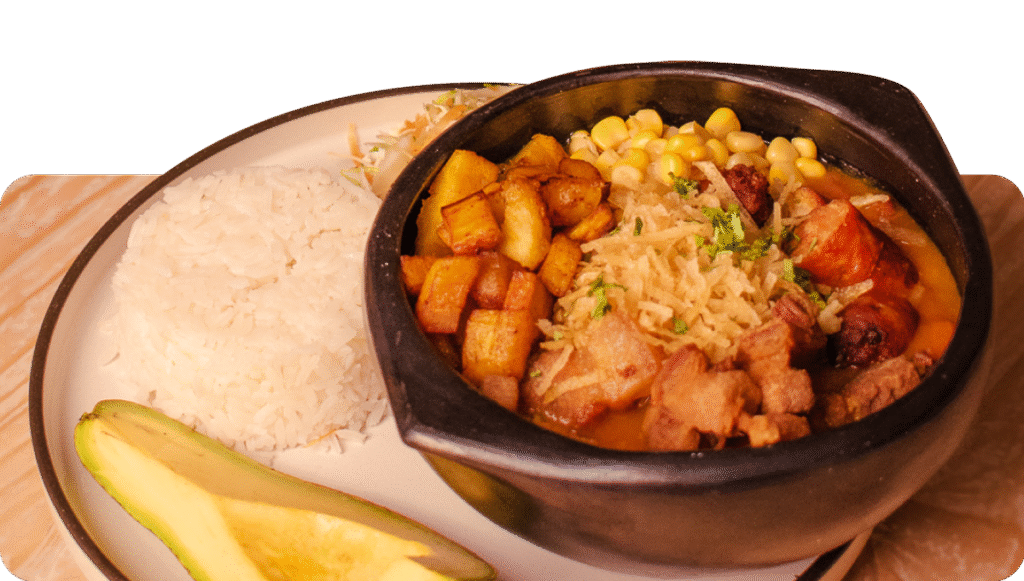 Comida de barrio que se respeta. Una cazuelita paisa cargada de fríjoles, carne, chicharrón y plátano maduro, de esas que reconfortan desde la primera cucharada.