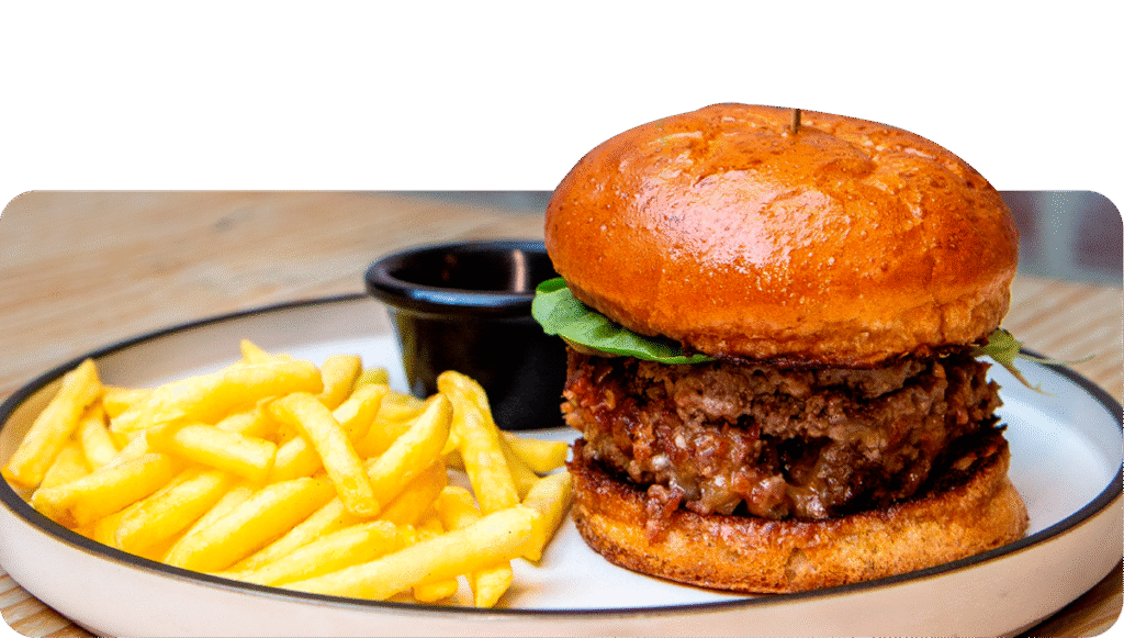 Exclusiva hamburguesa deconstruída, 150gr de carne de res, mermelada de tocineta, mix de quesos importados, salsa de la casa y queso cheddar.